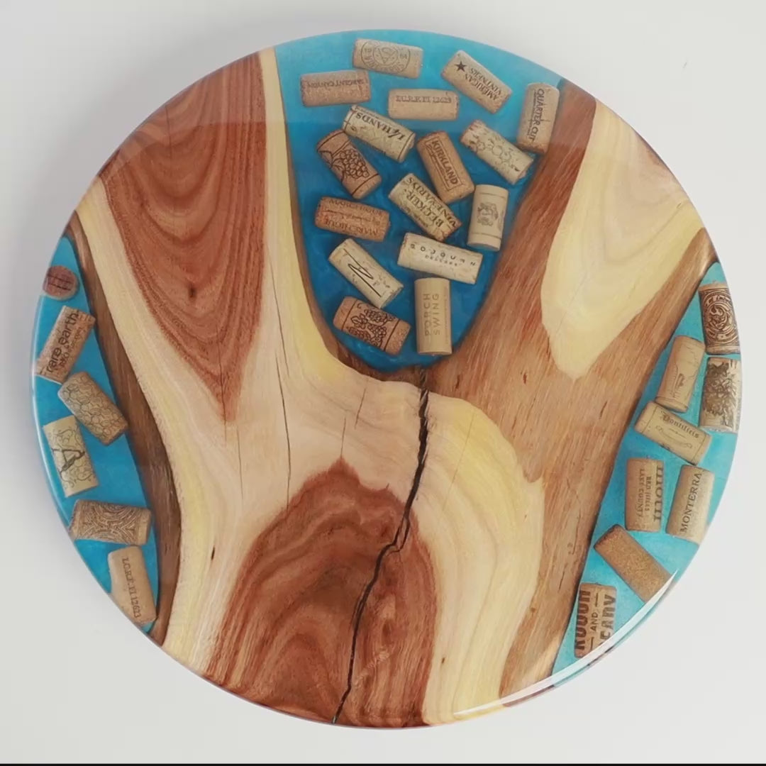 A very unique Lazy Susan crafted from Willow Acacia wood and wine corks we've been collecting for a while. The bright blue accent color really "pops" and highlights the gorgeous wood grain and the cool corks. Finished with crystal clear table-top epoxy that is food safe and beautiful.